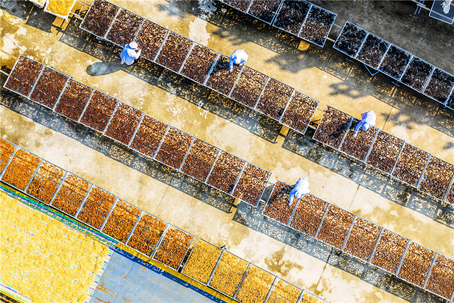 12月10日,通道菁蕪洲鎮(zhèn)中藥材集散中心,農(nóng)民正在晾曬黃精。