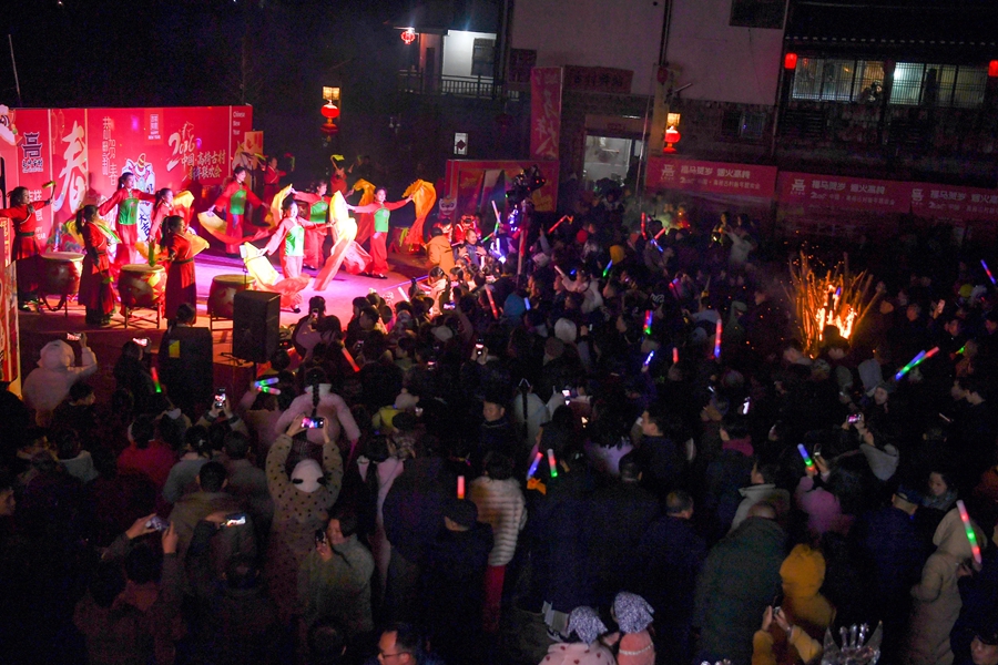 2月16日,除夕夜。在龍鼓隊(duì)擂響的開場(chǎng)舞《中國(guó)范》的表演中,會(huì)同縣高椅古村“村歌賽暨春節(jié)晚會(huì)”火熱開演。金龍翻騰,鼓點(diǎn)激昂,點(diǎn)燃了現(xiàn)場(chǎng)千余名村民和游客的熱情。